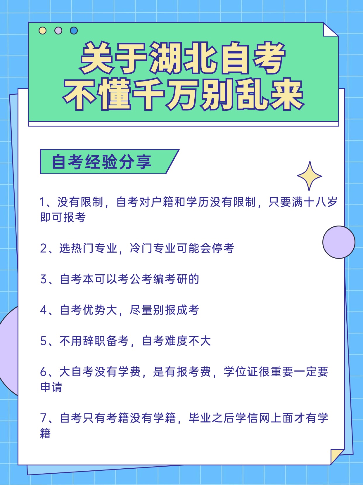 一、自考经验分享: 1、没有限制,自考对户籍和学历年龄没有限制 2、选热门专业,冷门专业可能会停考 3、自考本可以考公考编考研的 4、自考优势大,尽量别报成考 5、不用辞职备考,自考难度不大 6、大自考没有学费,是有报考费,学位证很重要一定要申请 7、自考只有考...