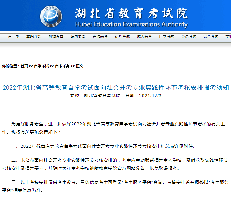 2022年湖北省自考面向社会开考专业实践性环节考核安排报考须知